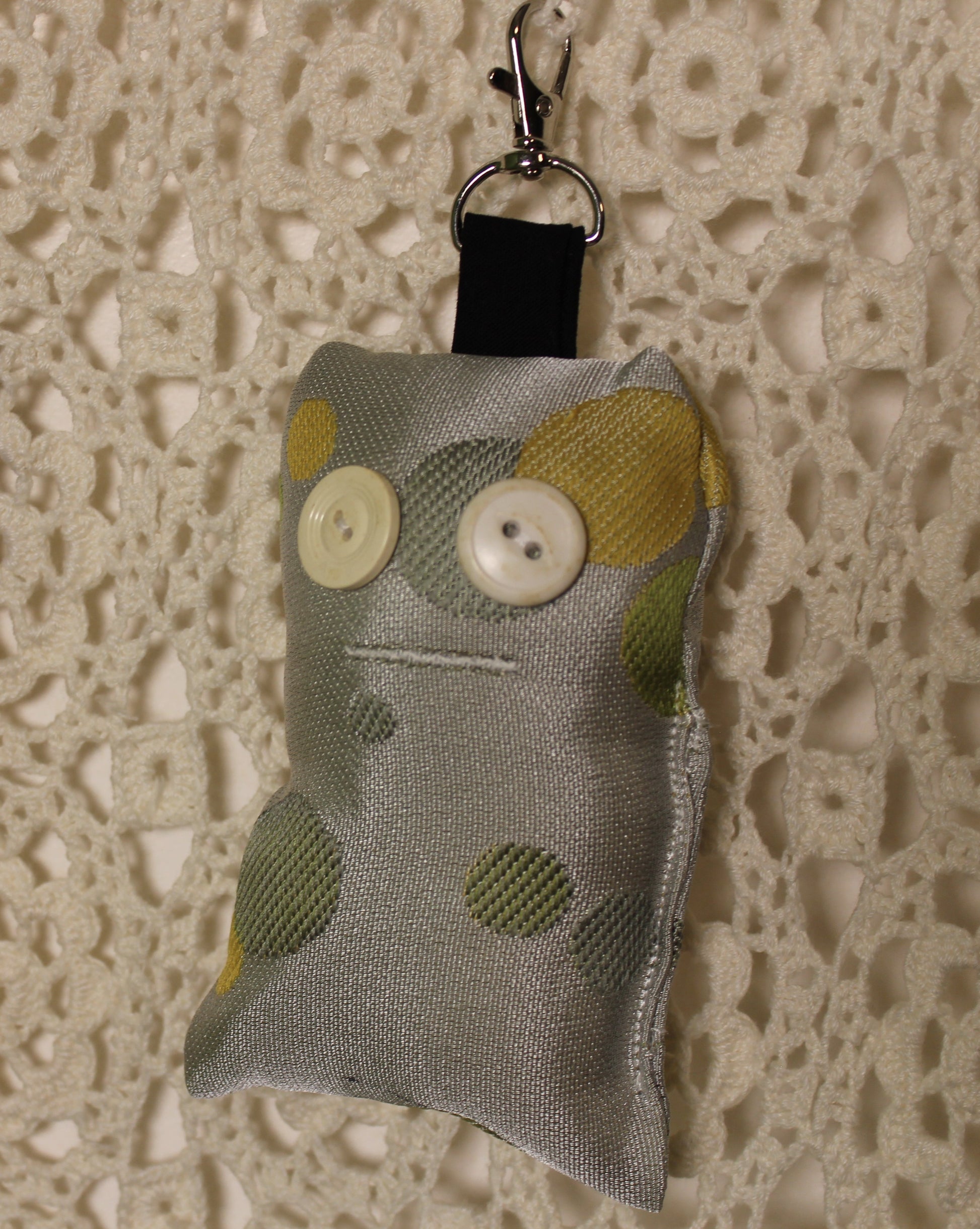 I’m a one-of-a-kind keybooboo guy, handmade from scrap fabric and finished with one (or two 👀) vintage button eyes from my Grandma’s collection. I’m a little weird, very cute, and proudly imperfect — no two of us are alike.